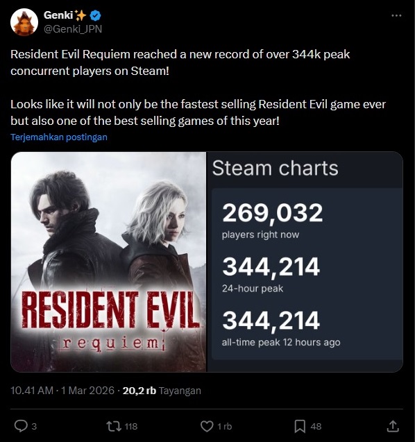 Game terbaru dari franchise legendaris Resident Evil, Resident Evil Requiem, mencatat pencapaian impresif di platform PC. Berdasarkan data dari SteamDB yang kemudian dibagikan oleh akun X Genki_JPN, game ini berhasil menyentuh puncak 344 ribu pemain bersamaan (peak concurrent players).