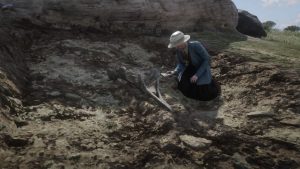 Jika kamu menjelajahi dunia luas RDR2, kamu bisa menemukan peninggalan fosil dinosaurus di beberapa titik peta. Ini menjadi bagian dari Stranger Mission berjudul “A Test of Faith”, di mana kamu bertemu dengan Deborah MacGuiness, seorang paleontologist eksentrik yang mengklaim sedang meneliti makhluk prasejarah di dunia Barat.