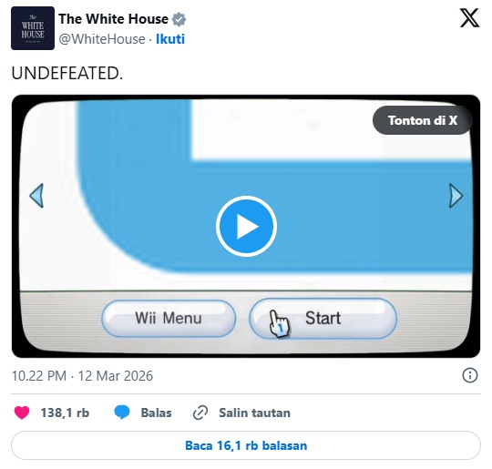 Akun resmi Gedung Putih di platform X (Twitter) menuai kontroversi setelah membagikan sebuah video yang menggabungkan elemen video game dengan rekaman operasi militer Amerika Serikat di Iran. Dalam video tersebut, terlihat potongan visual yang menyerupai gameplay dari konsol Nintendo Wii, yang dipadukan dengan rekaman nyata dari serangan militer.