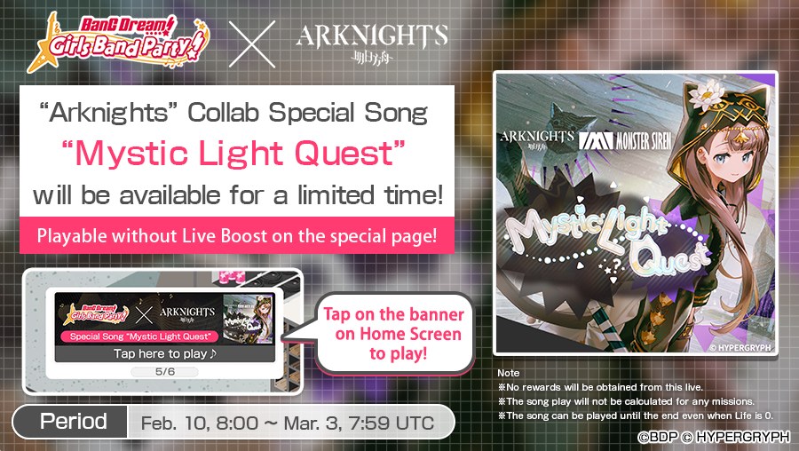 Kolaborasi spesial antara BanG Dream! Girls Band Party! dan Arknights resmi menghadirkan konten terbatas yang sayang untuk dilewatkan. Dalam event crossover kali ini, pemain bisa menikmati lagu kolaborasi berjudul “Mystic Light Quest” yang tersedia untuk dimainkan dalam waktu terbatas.