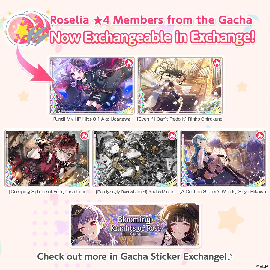 Pemain dapat menggunakan Gacha Stickers dari banner “Blooming Knights of Rose Gacha” untuk menukarkan karakter ★4 pilihan mereka. Beberapa member Roselia ★4 yang tersedia di Exchange antara lain: