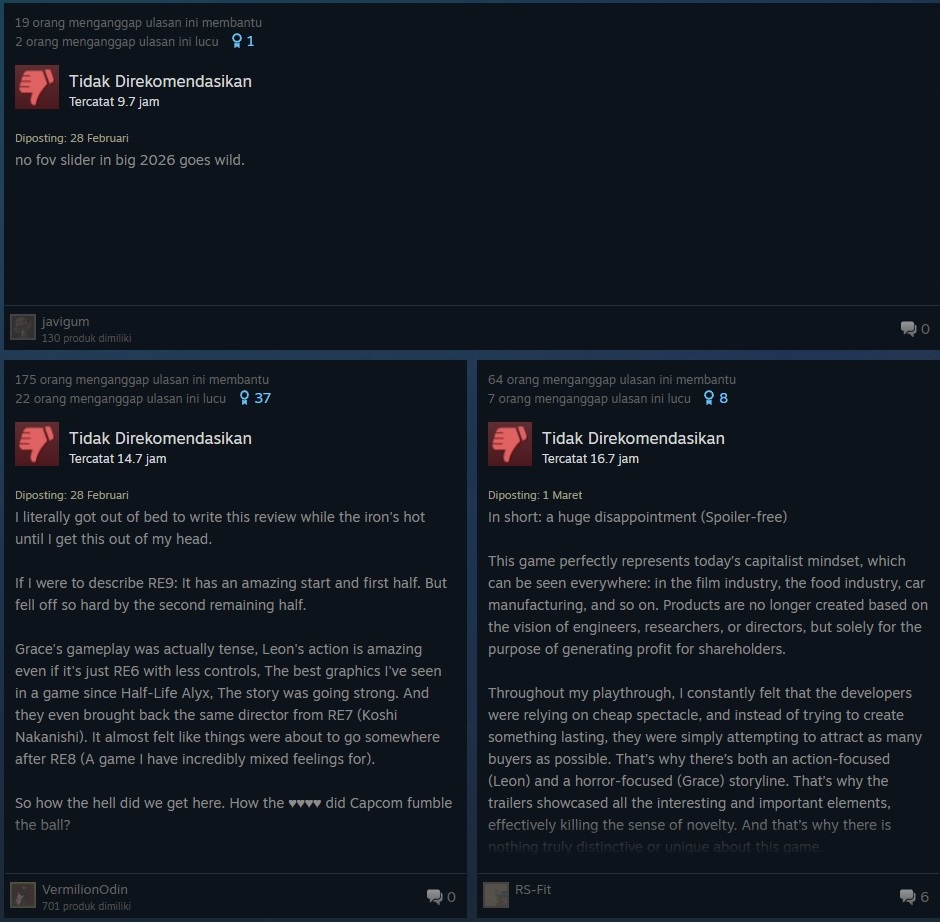 Dalam thread populer di Reddit, beberapa user mengunggah potongan review dari Steam yang hanya berisi komentar seperti: