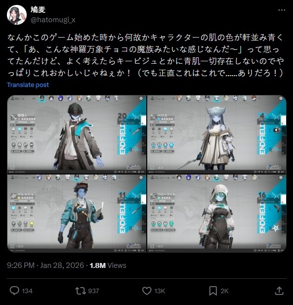 Yang menarik, bug ini tidak langsung dianggap sebagai kesalahan oleh semua pemain. Dengan nuansa cerita Endfield yang sarat unsur sci-fi dan space opera, melihat karakter seperti Endministrator dan Perlica berkulit biru di awal permainan justru terasa “masuk akal” bagi sebagian pemain Jepang. Bahkan, ada yang mengira tampilan tersebut merupakan pilihan artistik atau referensi visual ala animasi futuristik.