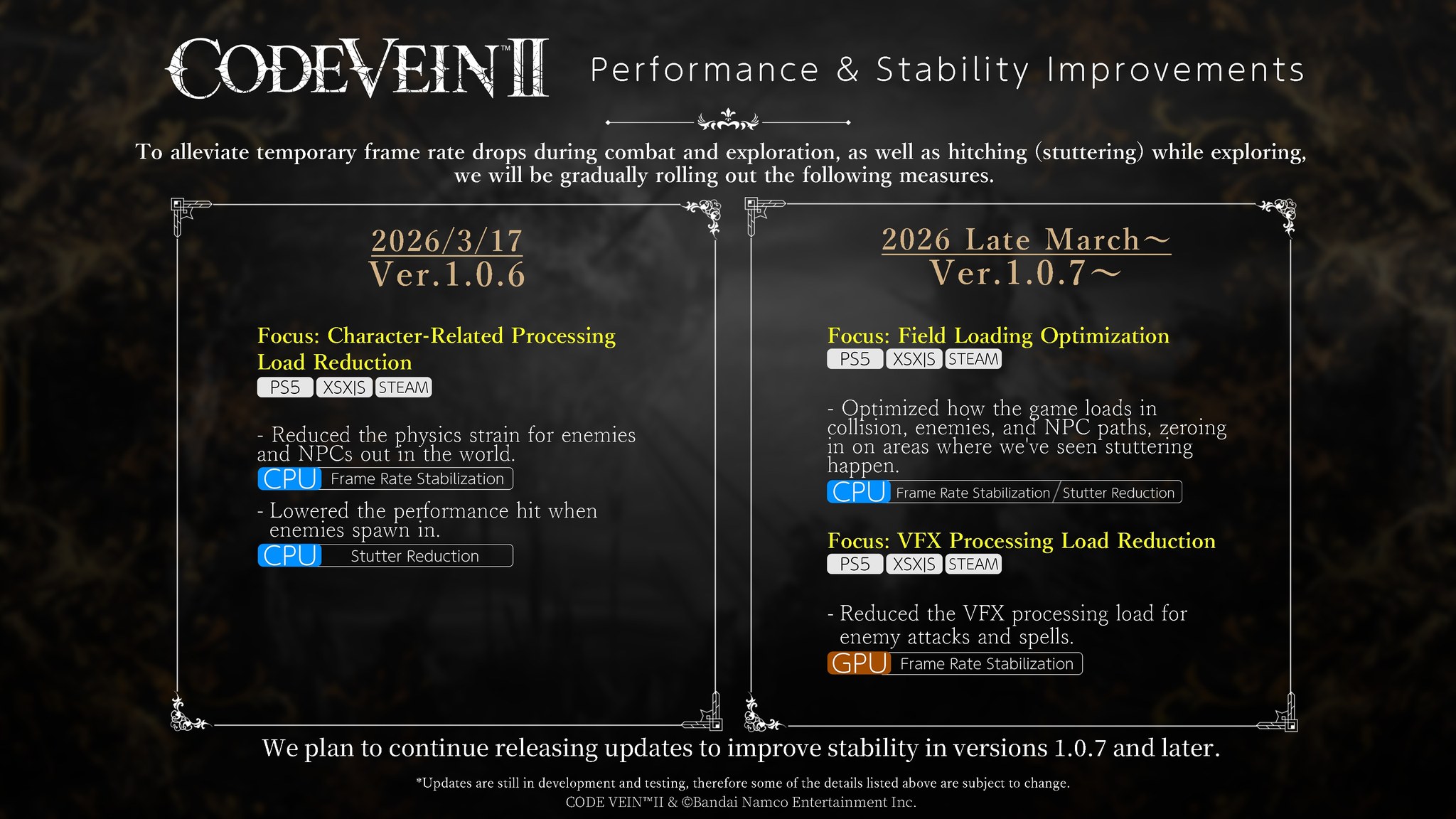 Developer akhirnya merilis patch terbaru untuk Code Vein II, yaitu Update Ver. 1.0.6, yang berfokus pada peningkatan stabilitas performa saat pertarungan dan eksplorasi. Update ini menjadi langkah awal untuk memperbaiki berbagai masalah frame rate drop dan stuttering yang sebelumnya sering dirasakan pemain.