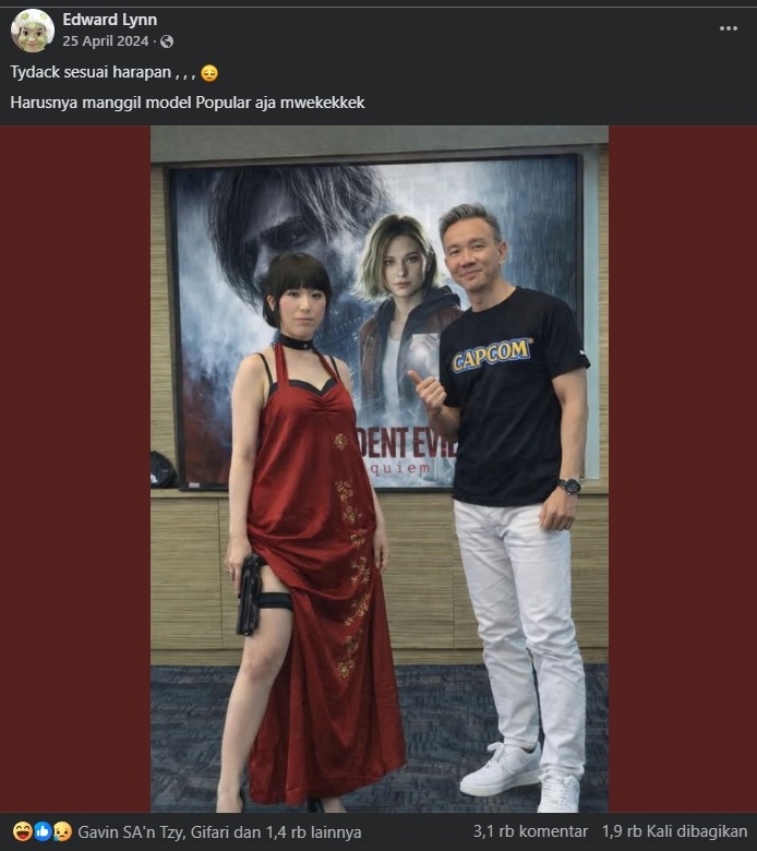 Postingan tersebut diunggah oleh akun Facebook Edward Lynn pada 25 April 2024. Dalam foto yang kini ramai dibagikan ulang, Larissa terlihat berpose mengenakan kostum merah elegan yang terinspirasi dari karakter Ada Wong, di depan poster bertema Resident Evil Requiem.