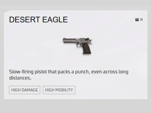 Desert Eagle (sering disebut Deagle) adalah pistol ber – damage tinggi yang mampu memberikan tembakan presisi mematikan di jarak menengah. Walaupun termasuk sidearm, kekuatannya bisa menyaingi beberapa AR dan SMG dalam duel 1 lawan 1. Deagle sering dipakai di mode Clash Squad karena harganya murah namun sangat mematikan jika aim akurat.