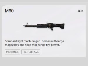 M60 adalah senjata bertipe LMG (Light Machine Gun) yang dikenal karena magazine super besar dan kemampuan menembak terus – menerus tanpa harus sering reload. Senjata ini sangat cocok untuk suppressing fire, menahan lawan, atau melawan banyak musuh sekaligus.