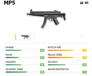 Akurasi Tinggi : Dibandingkan SMG lain, MP5 memiliki stabilitas tembak yang sangat baik. Cocok untuk duel jarak dekat hingga menengah (10 – 20 meter).