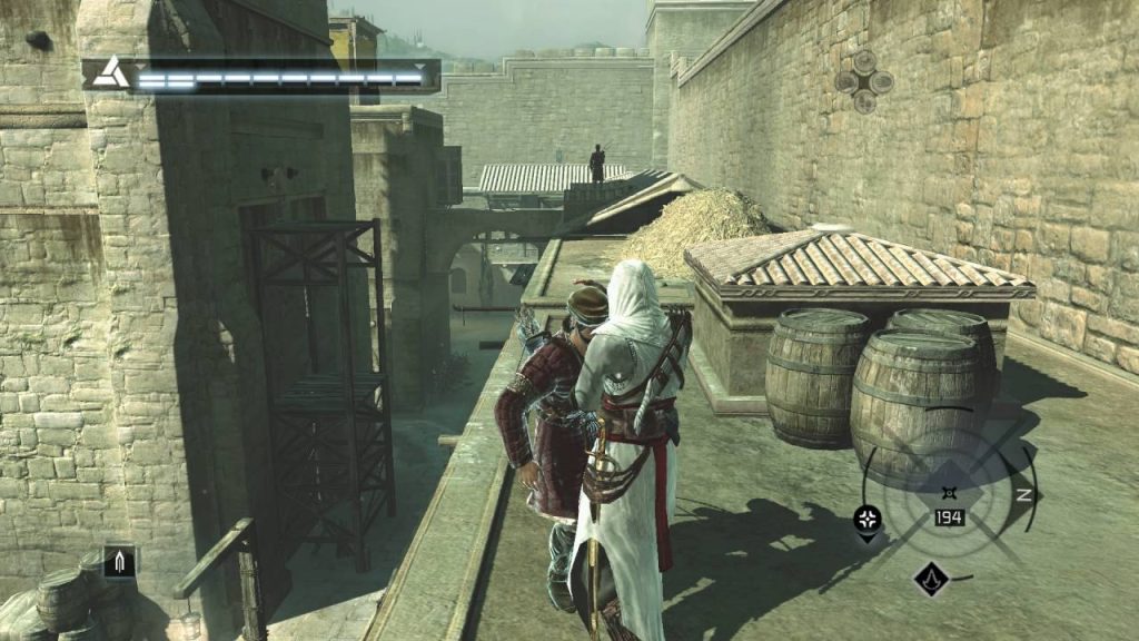 Assassin’s Creed 2007 menghadirkan gameplay yang revolusioner untuk masanya. Free – running / Parkour : Pemain bisa memanjat hampir semua bangunan dengan animasi halus – fitur ini menjadi ciri khas utama seri. Stealth Kill : Misi utama mengharuskan pemain membunuh target dengan strategi dan penyamaran. Exploration : Dunia terbuka mencakup kota – kota besar seperti Jerusalem, Acre, dan Damascus. Crowd System : Pemain bisa berbaur di tengah keramaian untuk menghindari penjaga – inovatif untuk tahun 2007. Namun, gameplay – nya terkadang terasa monoton. Banyak misi bersifat repetitif – seperti menyadap percakapan, mencopet, atau mengintimidasi – sebelum bisa mengeksekusi target utama.