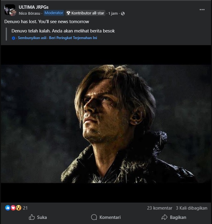 Jika diterjemahkan, pernyataan tersebut berarti “Denuvo telah kalah. Anda akan melihat beritanya besok.” Unggahan itu langsung memicu spekulasi luas, terutama karena gambar yang menyertainya menampilkan karakter dari Resident Evil: Requiem.