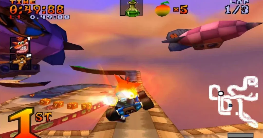 Sistem drift dan turbo yang canggih untuk zamannya juga membuat pemain bisa meningkatkan kecepatan dengan skill, bukan sekadar keberuntungan. Power – up seperti TNT Crate, Missile, dan Aku Aku/Uka Uka mask menambah keseruan di lintasan, menjadikan setiap balapan penuh aksi dan tak terduga.