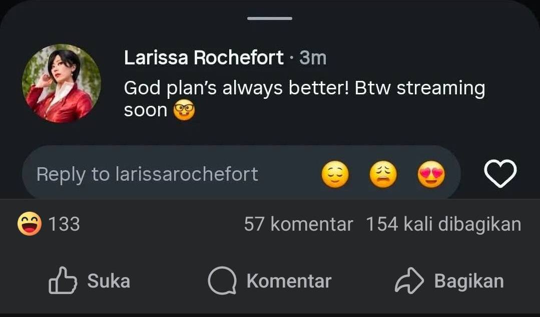 Di sisi lain, Larissa sempat mengunggah pesan singkat bernada santai di media sosial, yang membuat sebagian pengikutnya bertanya-tanya apakah itu berkaitan dengan situasi ini atau tidak.