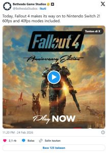 Perusahaan Bethesda Game Studios resmi menghadirkan Fallout 4: Anniversary Edition ke platform Nintendo Switch 2 pada 24 Februari 2026 (digital), dengan edisi fisik rilis 28 April 2026 mendatang. Ini menjadi pertama kalinya Fallout 4, salah satu RPG dunia terbuka paling berpengaruh, hadir secara resmi di konsol Nintendo terbaru.