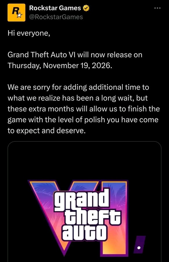 “Kami ingin memastikan bahwa Grand Theft Auto VI memenuhi standar tertinggi Rockstar Games. Beberapa bulan tambahan ini akan membantu kami mencapai hasil terbaik yang layak diterima oleh para pemain,” tulis pihak Rockstar.
