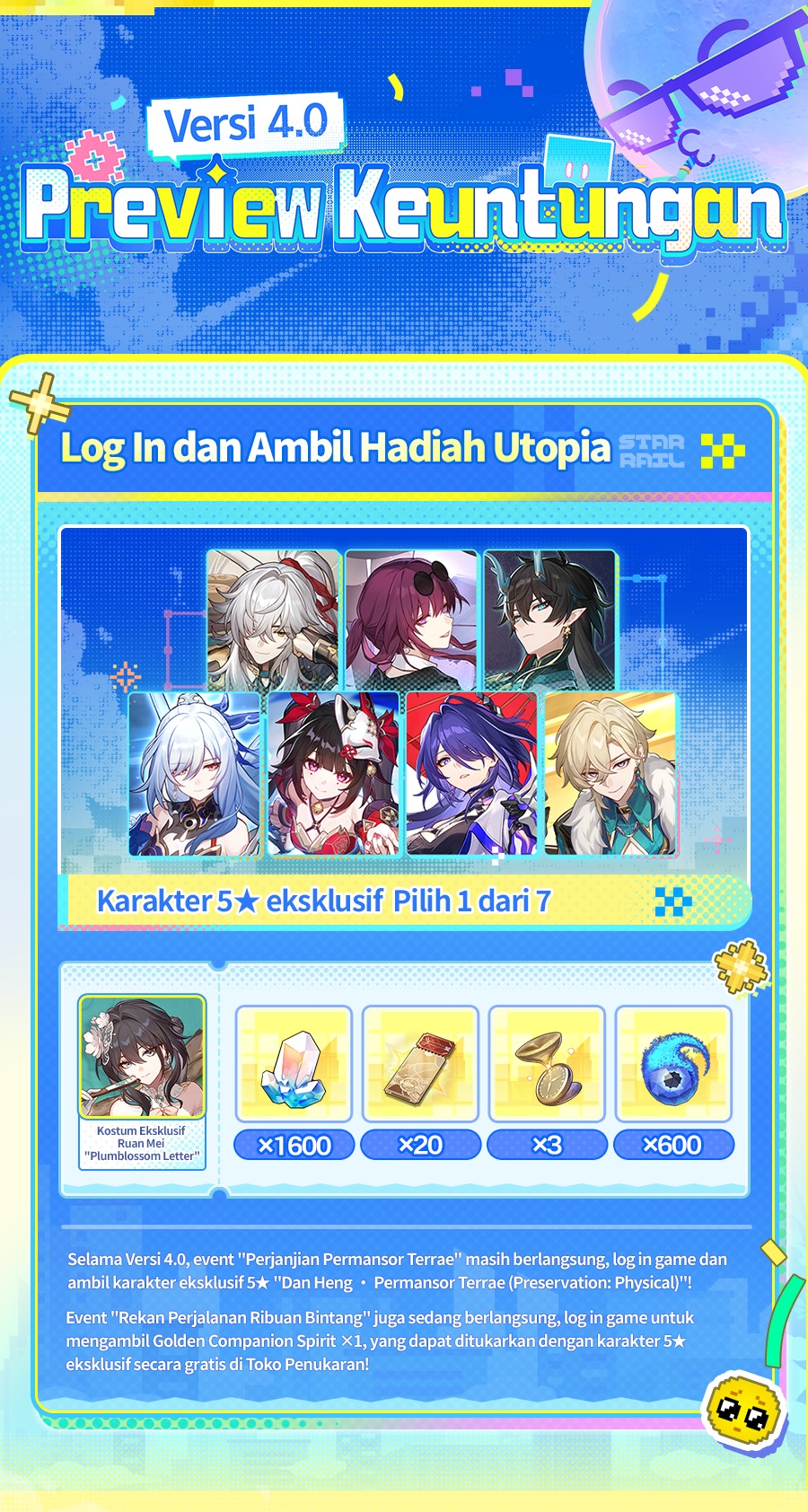 Sorotan utama tentu saja adalah hadiah karakter 5★ eksklusif gratis. Pemain (Trailblazer) bisa memilih 1 dari total 7 karakter 5★ hanya dengan login ke dalam game selama periode event.