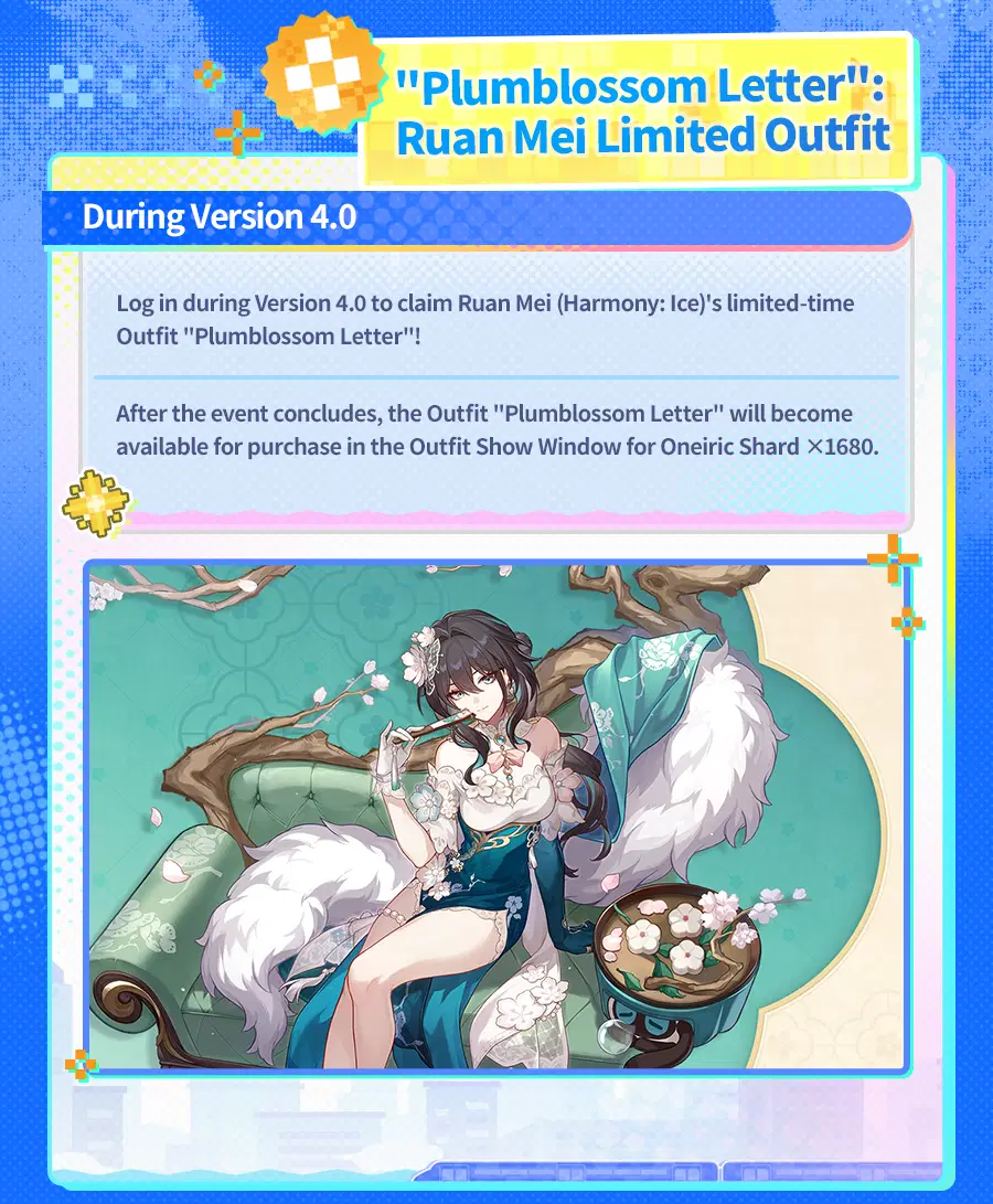 Versi 4.0 juga menghadirkan kostum eksklusif Ruan Mei bertajuk “Plumblossom Letter” yang bisa didapatkan secara gratis. Selain kosmetik, pemain juga akan menerima berbagai item premium, antara lain: