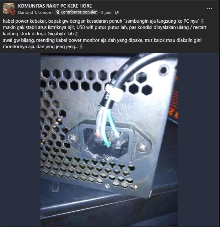 Dalam ceritanya, ia mengaku tetap menyalakan PC meski sebelumnya terjadi insiden kabel power meleleh. Alih-alih mengganti unit power supply (PSU), kabel tersebut justru disambungkan langsung ke bagian dalam PSU agar perangkat tetap bisa digunakan.