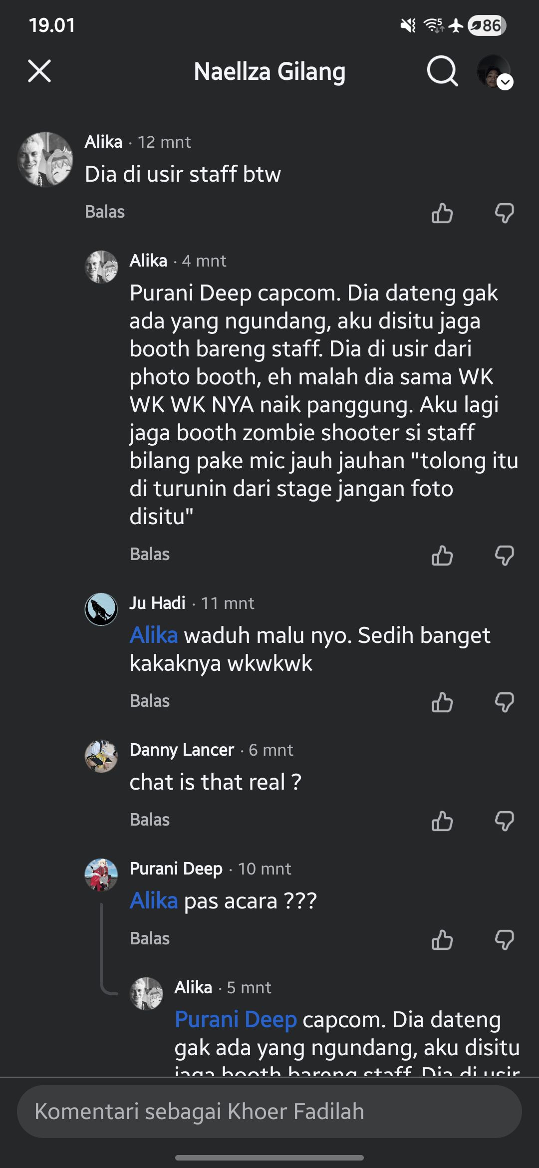 Kolom komentar di berbagai unggahan pun dipenuhi beragam opini. Ada yang menyayangkan jika benar dirinya diusir dari acara, menganggap situasi tersebut memalukan dan tidak perlu terjadi di ruang publik.