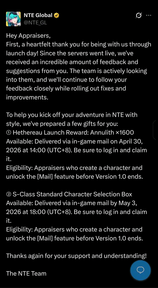 Peluncuran NTE disambut dengan respons positif dari komunitas, dan developer pun langsung memberikan hadiah menarik sebagai bentuk apresiasi. Dengan bonus seperti Annulith dan karakter S-Class gratis, ini menjadi momen terbaik bagi pemain baru untuk mulai bermain.