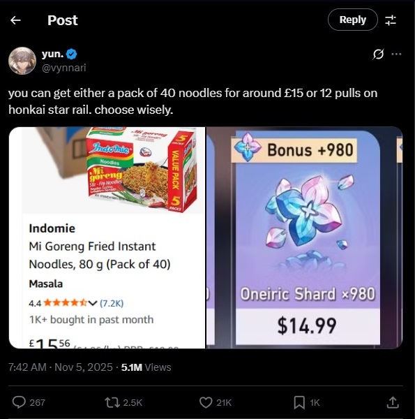 “You can get either a pack of 40 noodles for around £15 or 12 pulls on Honkai Star Rail. Choose wisely.”
