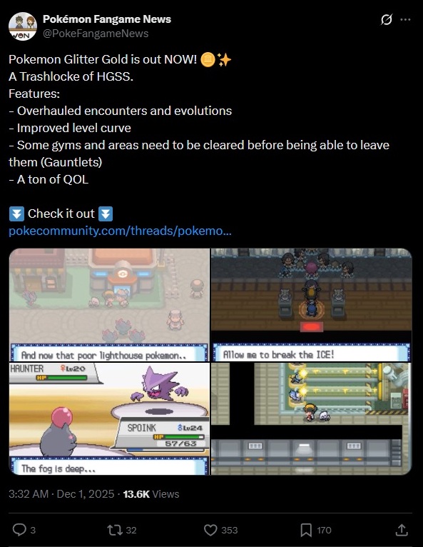 Komunitas Pokémon Fangame kembali dikejutkan dengan perilisan Pokémon Glitter Gold, sebuah proyek Trashlocke yang dibuat berdasarkan Pokémon HeartGold & SoulSilver (HGSS). Informasi resmi yang dibagikan melalui akun Pokémon Fangame News mengonfirmasi bahwa game ini kini sudah dapat dimainkan oleh publik.
