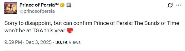 Kabar kurang menyenangkan datang bagi para penggemar Prince of Persia. Melalui akun resmi X (Twitter) waralaba tersebut, Ubisoft mengumumkan bahwa Prince of Persia: The Sands of Time Remake tidak akan tampil di acara The Game Awards (TGA) 2025.