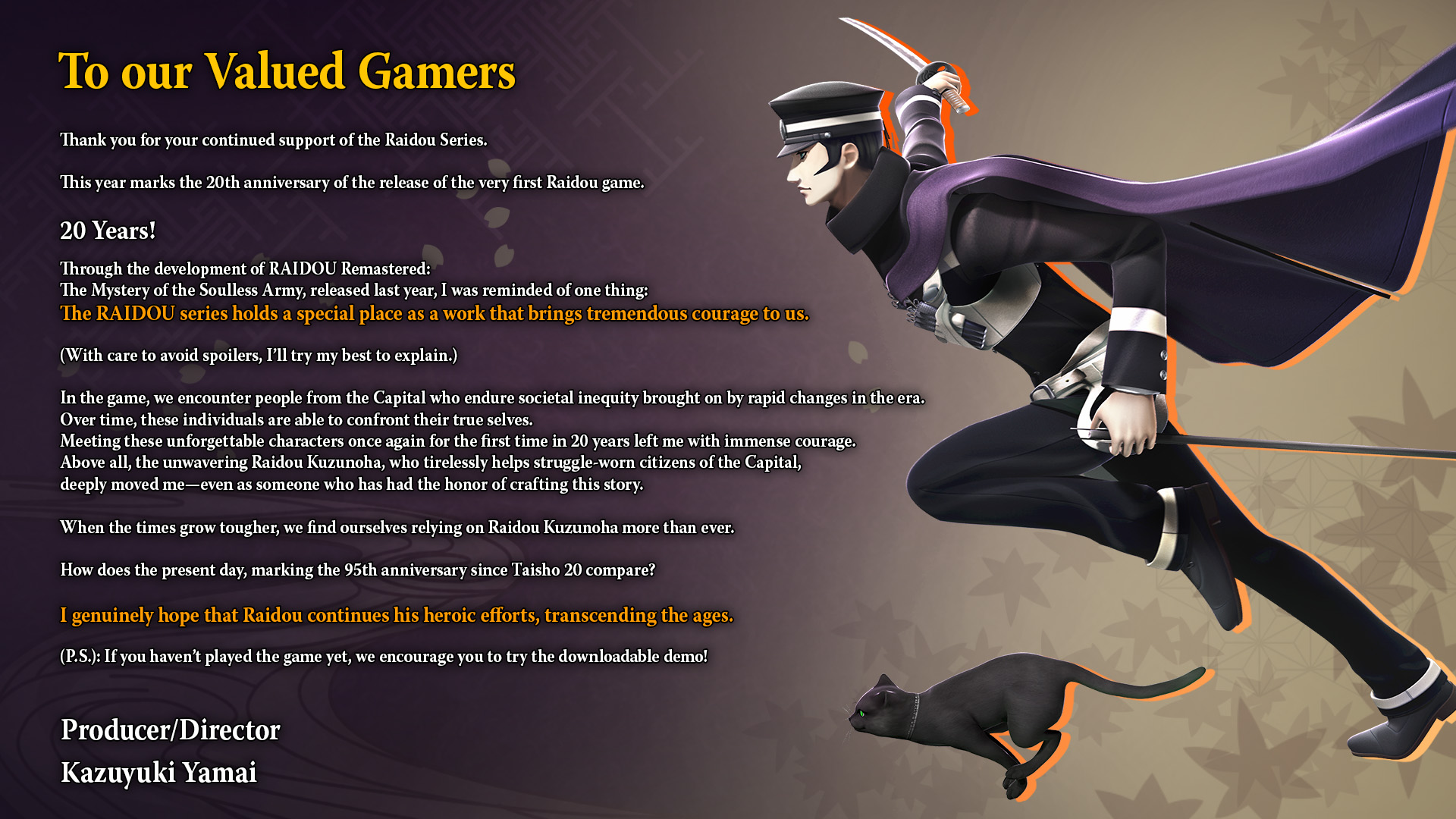 Dalam pernyataannya, Kazuyuki Yamai menulis bahwa seri RAIDOU bukan sekadar game tetapi karya penuh semangat yang telah memberikan inspirasi serta keberanian bagi tim pengembang maupun para pemain selama bertahun-tahun.