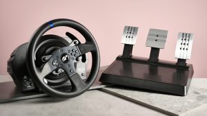 Build quality dan feel wheel yang nyaman : Roda dibungkus karet/tekstur yang nyaman digenggam, dengan sentuhan “racing wheel” yang lebih serius dibanding wheel plastik biasa. Pedal set (T3PA) juga terbuat dari logam/struktur kokoh, cukup responsif.