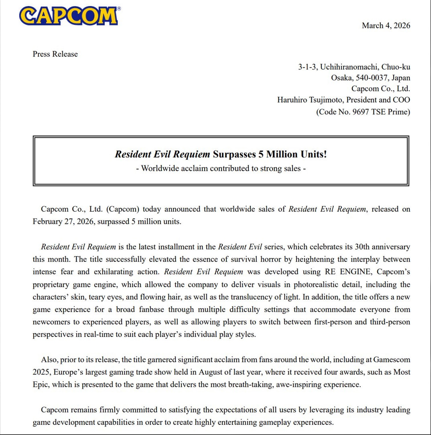 Selama lebih dari tiga dekade, franchise Resident Evil telah melahirkan banyak judul sukses. Namun, belum pernah ada seri yang mampu mencapai angka 5 juta unit dalam waktu secepat ini.