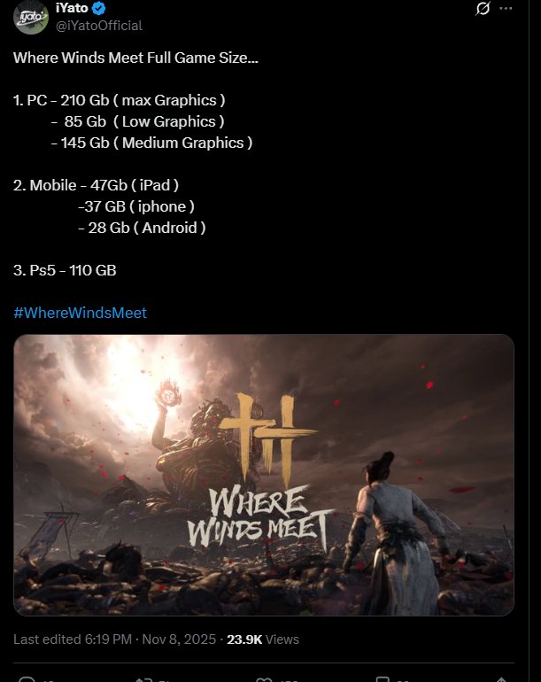 Dalam postingan yang kini ramai dibicarakan, disebutkan bahwa Where Winds Meet memiliki ukuran unduhan yang berbeda-beda tergantung platform dan kualitas grafis: