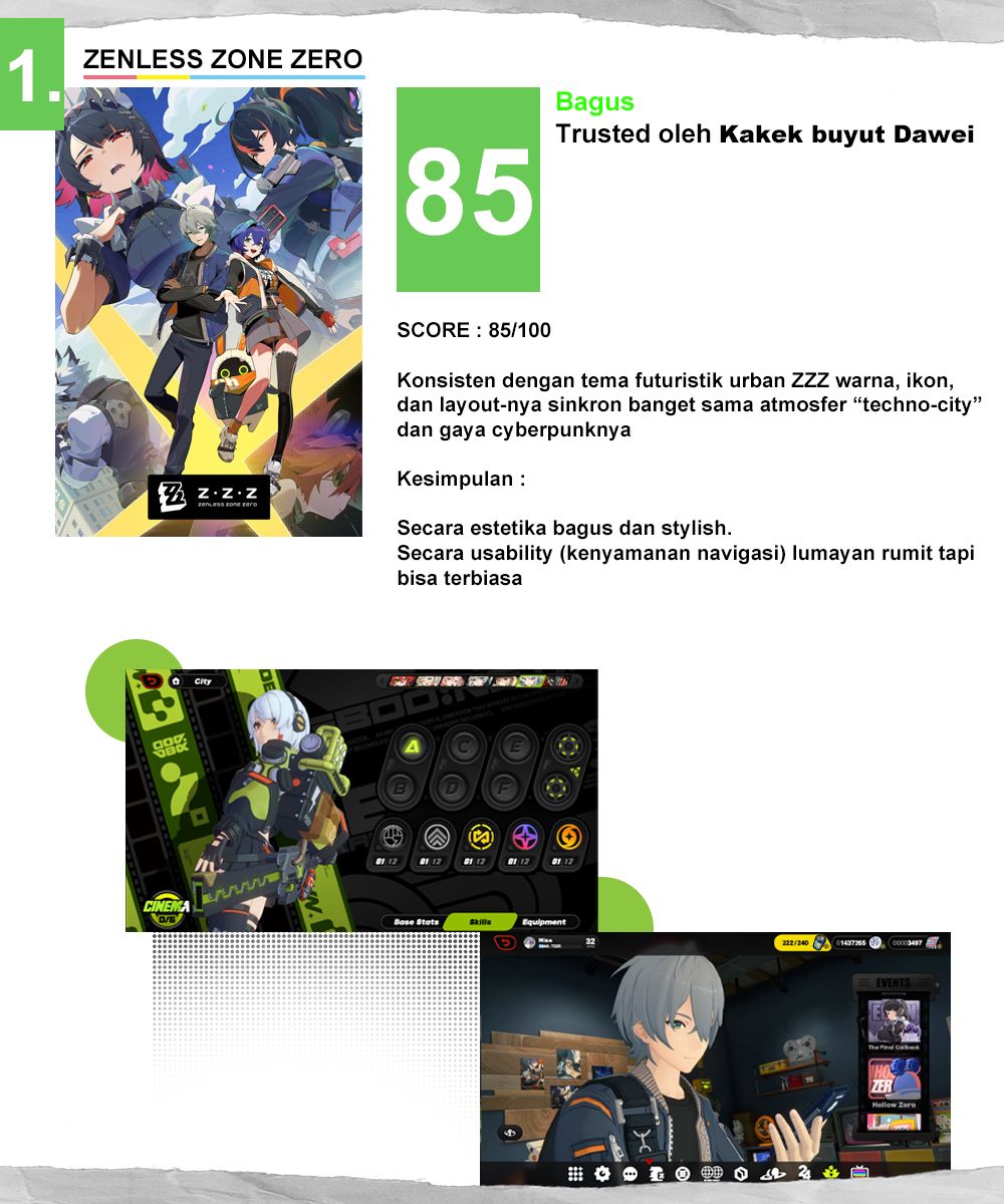 Desain antarmuka (UI) Zenless Zone Zero tampil konsisten dengan tema futuristik urban yang diusung. Setiap warna, ikon, dan tata letaknya benar-benar sinkron dengan atmosfer techno-city serta gaya cyberpunk-nya.