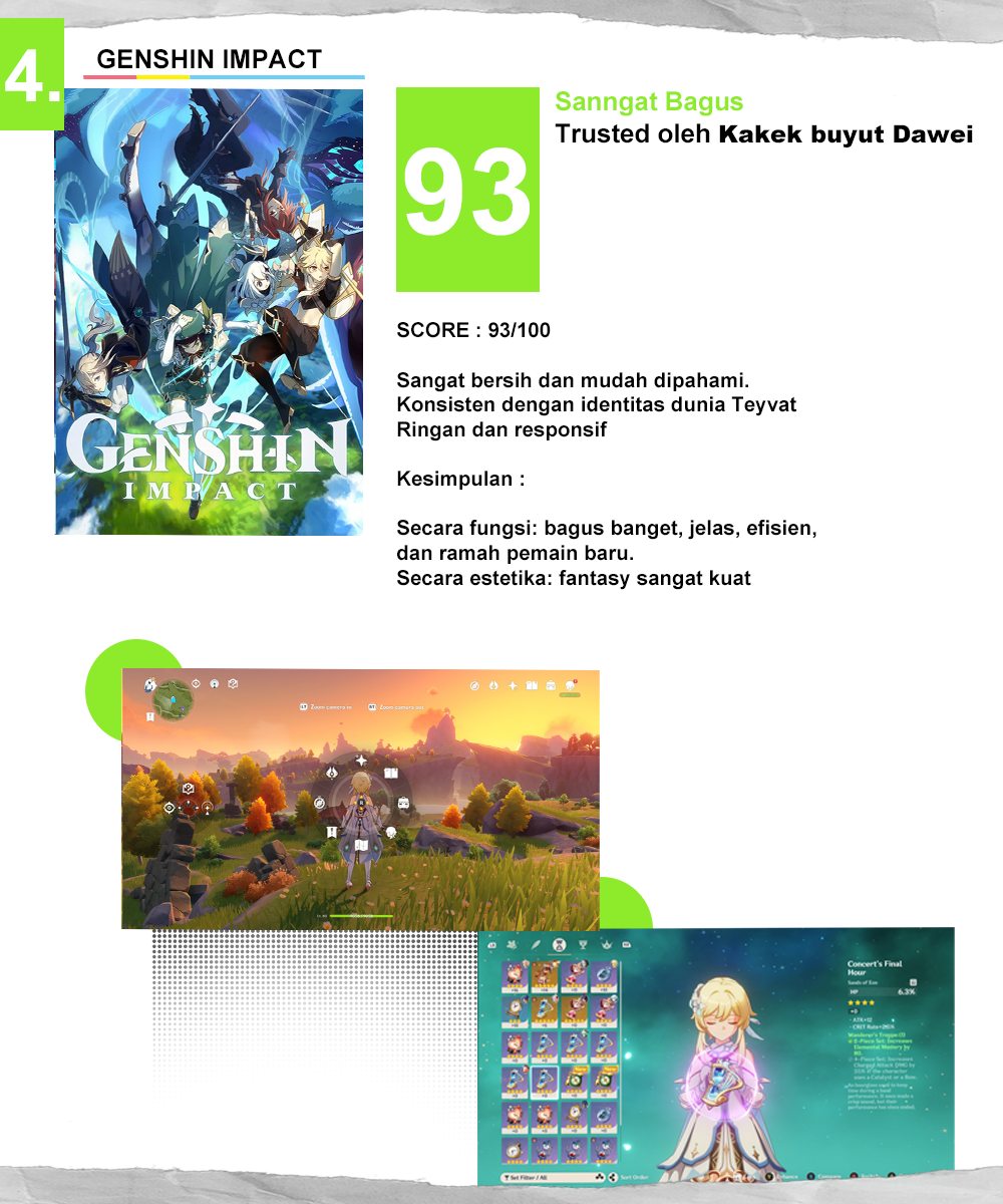 Menurut versi “Kakek Buyut Dawei”, kelima game ini punya ciri khas dan kelemahan masing-masing tapi Genshin Impact masih jadi benchmark terbaik untuk UI yang bersih dan ramah pemain.