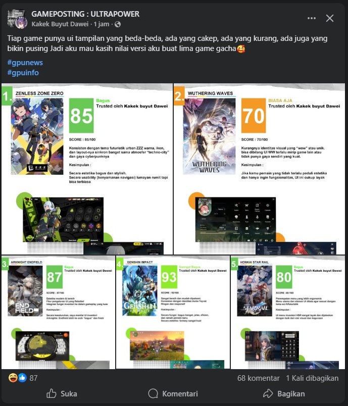 Sebuah postingan dari komunitas GAMEPOSTING: ULTRAPOWER baru-baru ini membagikan hasil penilaian beberapa game gacha populer. Dalam unggahan itu, pengguna bernama Kakek Buyut Dawei memberikan skor dan opini pribadi terhadap lima judul besar yang ramai dimainkan saat ini.