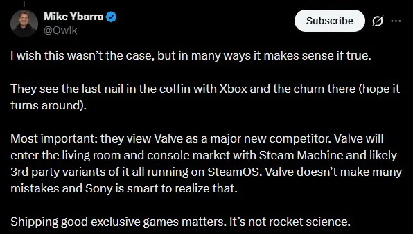 Persaingan dalam industri game terus berkembang seiring perubahan strategi perusahaan besar. Menurut pernyataan mantan Presiden Blizzard Entertainment, Mike Ybarra, perusahaan Sony Interactive Entertainment kini disebut memandang Valve Corporation sebagai pesaing yang lebih signifikan dibandingkan Xbox dalam lanskap industri game modern.