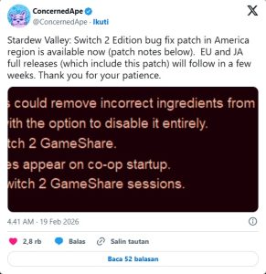 Dengan patch ini, pengalaman bertani, menjelajah, dan menjalin hubungan antar karakter di Pelican Town menjadi semakin nyaman di Nintendo Switch 2, sekaligus memberi alasan lebih kuat bagi pemain untuk kembali menanam dan bercocok tanam sepanjang tahun 2026.