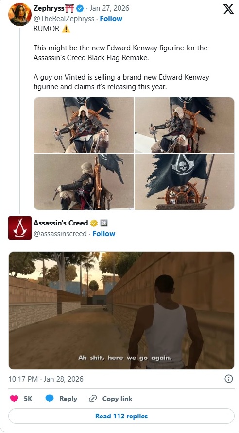 Setelah lama hanya beredar sebagai rumor dan bocoran, Ubisoft akhirnya memberikan pengakuan tidak langsung terkait remake Assassin’s Creed: Black Flag. Menariknya, konfirmasi ini tidak datang lewat pengumuman resmi, melainkan melalui sebuah meme ikonik dari GTA: San Andreas yang diunggah oleh akun resmi Assassin’s Creed.