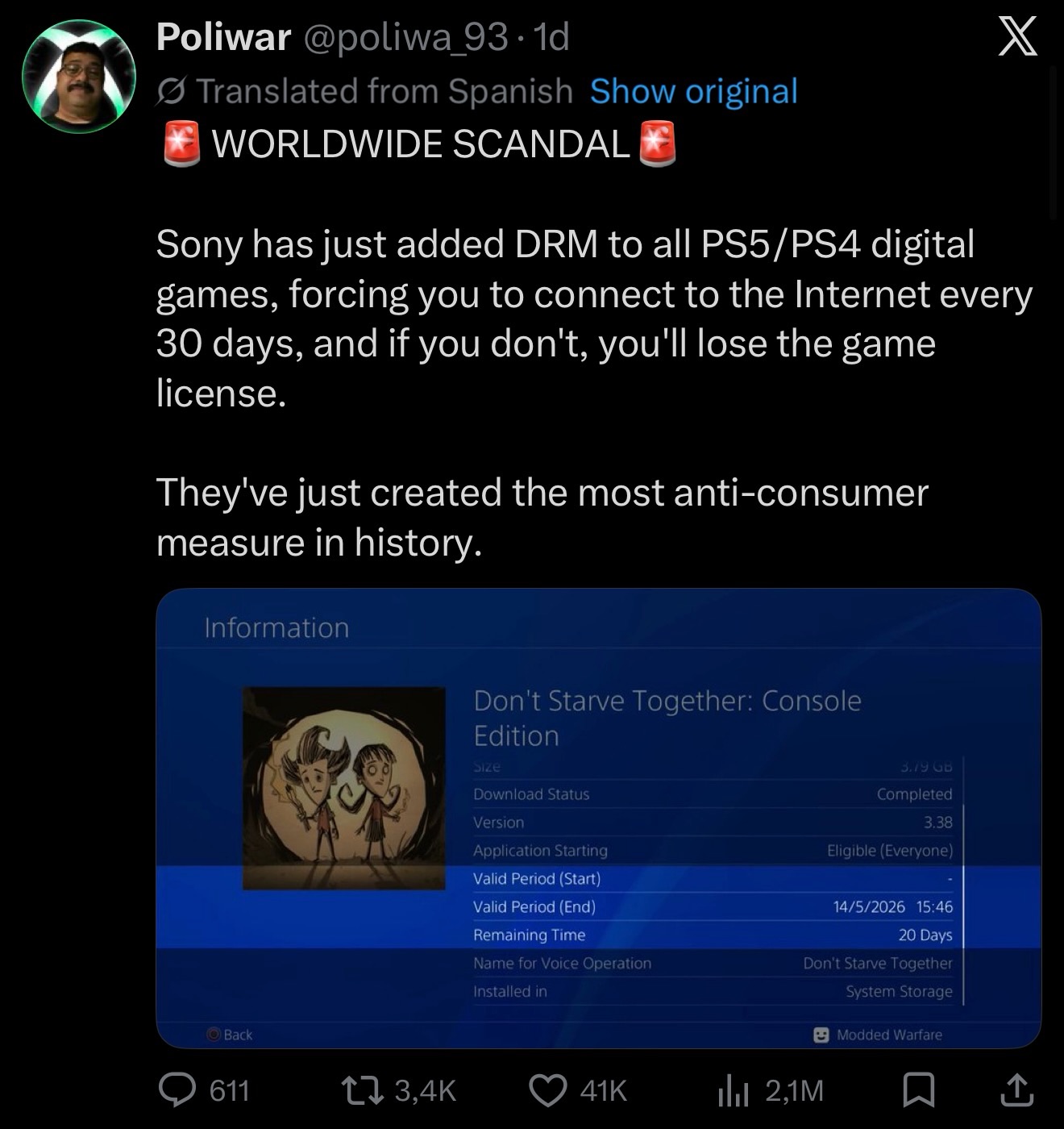 Sebuah unggahan di media sosial baru-baru ini ramai diperbincangkan setelah mengklaim bahwa Sony telah menambahkan sistem DRM baru pada seluruh game digital PlayStation 4 dan PlayStation 5. Dalam klaim tersebut disebutkan bahwa pemain diwajibkan untuk terhubung ke internet setiap 30 hari, atau berisiko kehilangan akses ke game yang dimiliki.