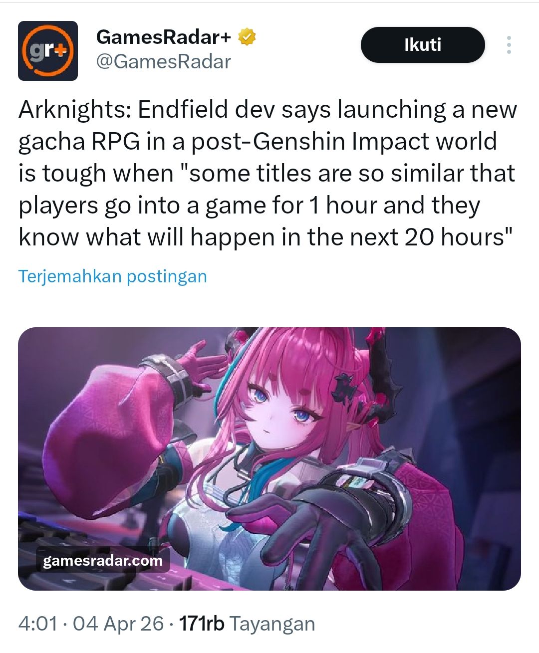 Dalam wawancara terbaru bersama GamesRadar+, developer Arknights: Endfield membagikan pandangan mereka mengenai tantangan besar dalam mengembangkan game gacha RPG di era pasca Genshin Impact.