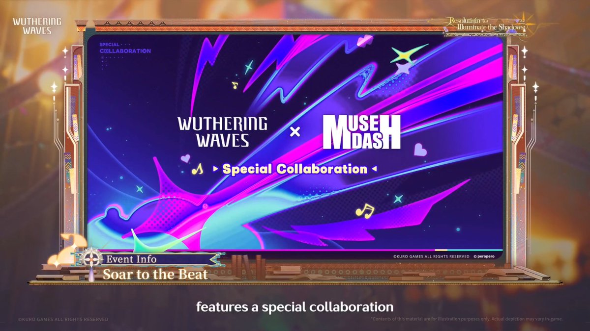 Event kolaborasi ini akan memperkenalkan Rhythm Challenge Event bertajuk “Soar to the Beat”, di mana pemain dapat menikmati berbagai lagu ikonik dari Muse Dash langsung di dalam dunia Wuthering Waves.